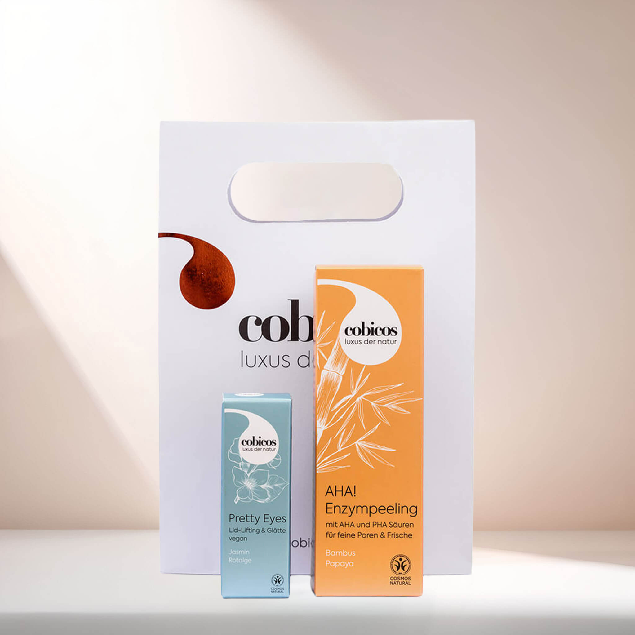 Ein Geschenk für alle Sinne: Diese Pflegeroutine kombiniert die revitalisierende Pretty Eyes Cream mit dem sanft peelenden AHA! Enzympeeling. Für sichtbar glattere, frischere Haut rund um Augen, Lippen und das gesamte Gesicht.
