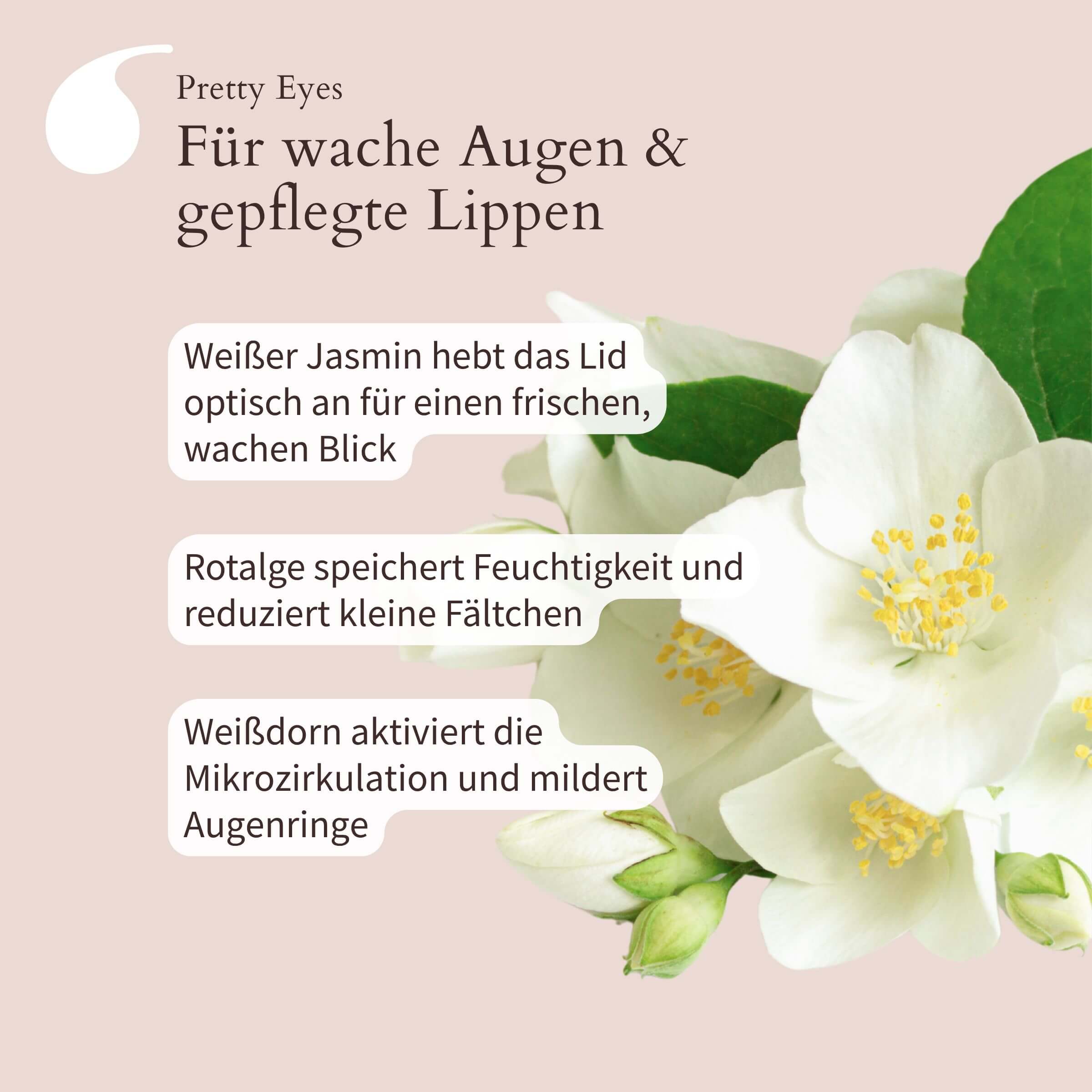 - Weißer Jasmin hebt das Lid optisch an – der Blick wirkt frischer und wacher.
